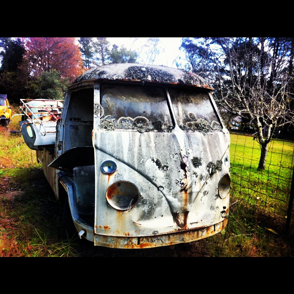 We stumbled across a VW graveyard on the weekend! It was very cool, with heaps of old VW Beetles, and a few Bay Window Kombis, Splitscreens and Type 3s.